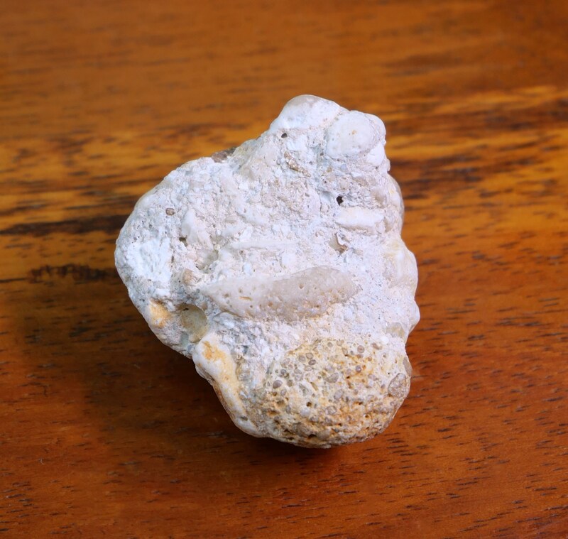 ナウル共和国の海岸で拾った小石がとても不思議な石でした。サンゴっぽい? と思ったのですが、よく見てみると、複数の鉱物が集まって塊になっているようにも見えます。その一部には、明らかに違う色、輝きをした鉱物らしきものが含まれていました。まさにナウルの謎石。