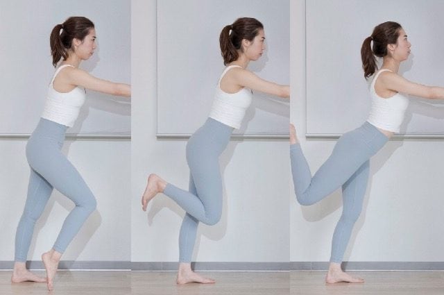 その後、かかとを(2)の位置に戻して20回繰り返し、その後反対の脚も同様に実践します。なお、実践中に前脚のひざが曲がった状態(下写真左)、上げている脚のひざの位置が下がった状態(下写真中)、腰が反った状態(下写真右)になると期待する効果を得られないので、姿勢には十分に注意して実践してくださいね。<エクササイズ監修:KEI(インストラクター歴3年)>