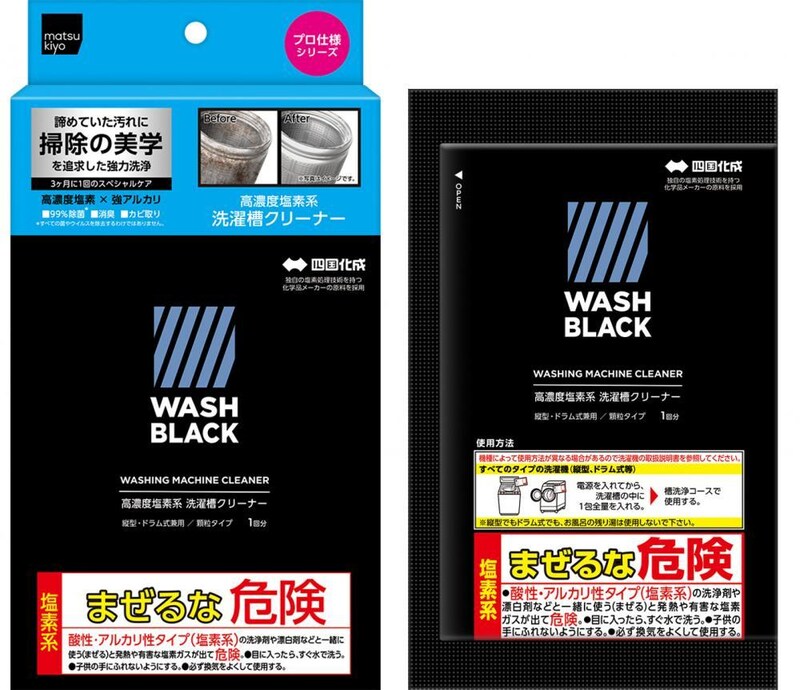 今回登場した、「matsukiyo WASHBLACK 高濃度塩素系 洗濯槽クリーナー」は、洗濯槽の黒カビ汚れにアプローチする洗濯槽用洗浄剤。