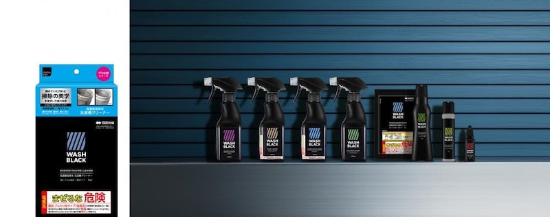「matsukiyo WASHBLACK」シリーズは、水アカ落とし、コゲ落とし、バスクリーナー、トイレクリーナー、エリそで用洗剤、シミとり洗剤など6商品を展開していて、プロ仕様の高い洗浄力を特長とする洗剤シリーズです。