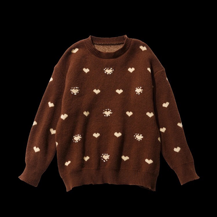 キュートなハート柄ニット。ガーリーなデザインも、ホワイトとブラウンの落ち着いた秋カラーなら、柄ボトムにもあわせやすい。