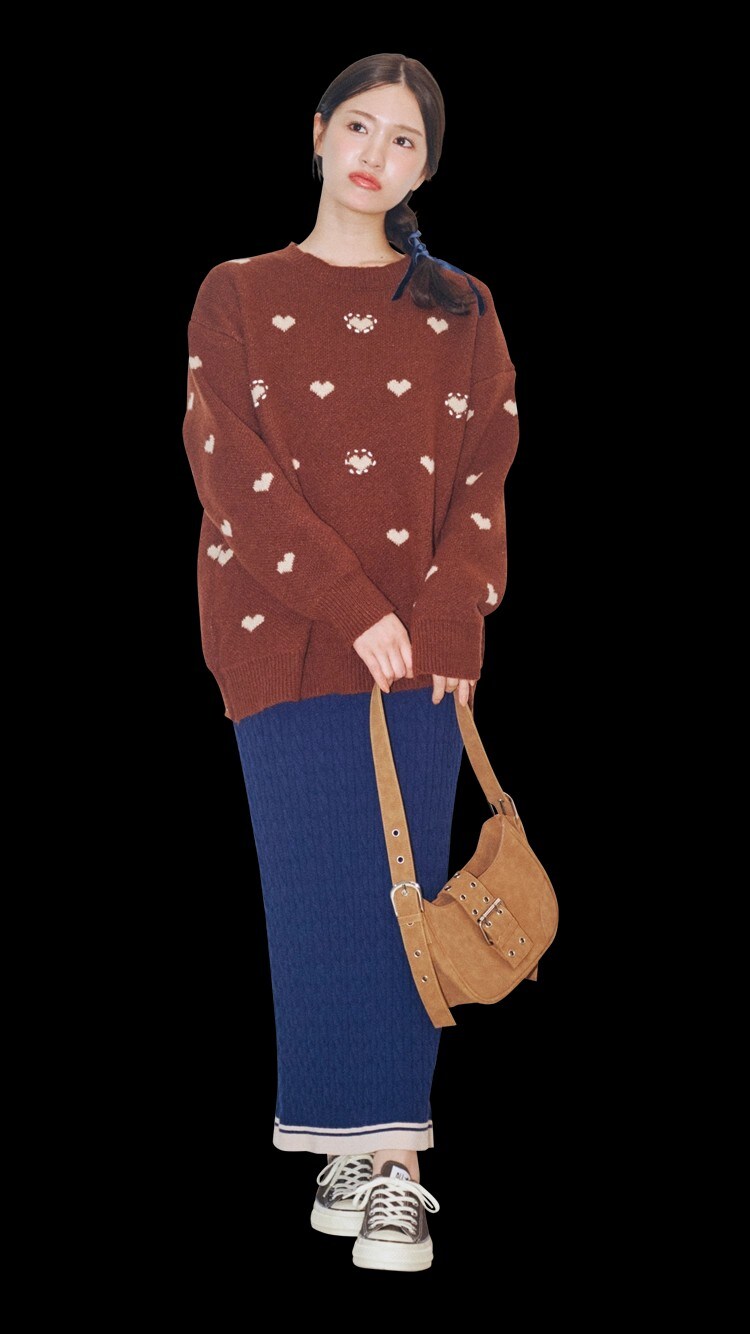 ハート柄ニットをざっくり、ネイビーのリブタイトで縦ライン強調。白スニーカーで軽さを出し、キャメルバッグでやわらかく。甘さは残しつつ、落ち着きもキープ♡