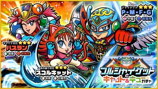 新たな☆3キャラクター「[ジャイケット]P・M・F・G」「[流し操り次代]スコルキャット」「[キャッチ次代]ハスラン」が登場する、「フルジャイケットとキャット&キューガチャ」を開始いたしました。