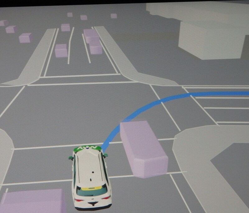 切り替えの瞬間はモニターに表示が出て、歩行者や自転車は赤い印で検知される仕組みです。