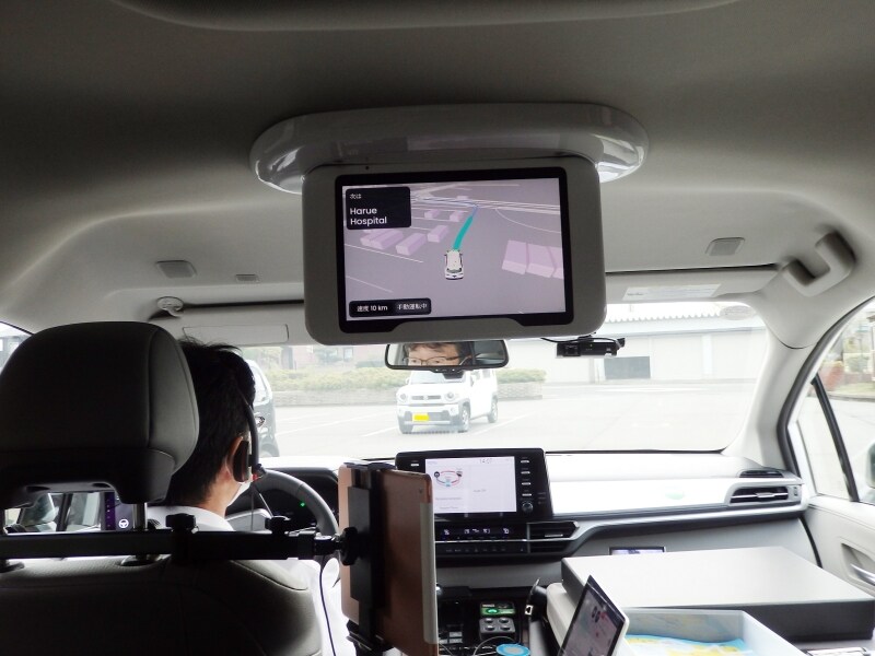 定刻になると、バン型の「イータクプラス」が滑るように到着。乗り込むと、運転席のすぐ後ろにモニターが設置され、車の周囲の様子が映し出されています。