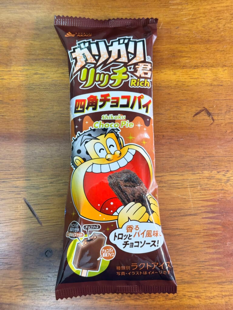 セブンイレブンのアイスクリームコーナーで、ガリガリ君の新たなテイストが販売されていました。その名も「ガリガリ君リッチ 四角チョコパイ」です。ええっ!? □チョコパイ!? 三角ではなくて!?