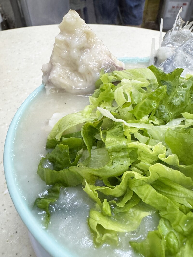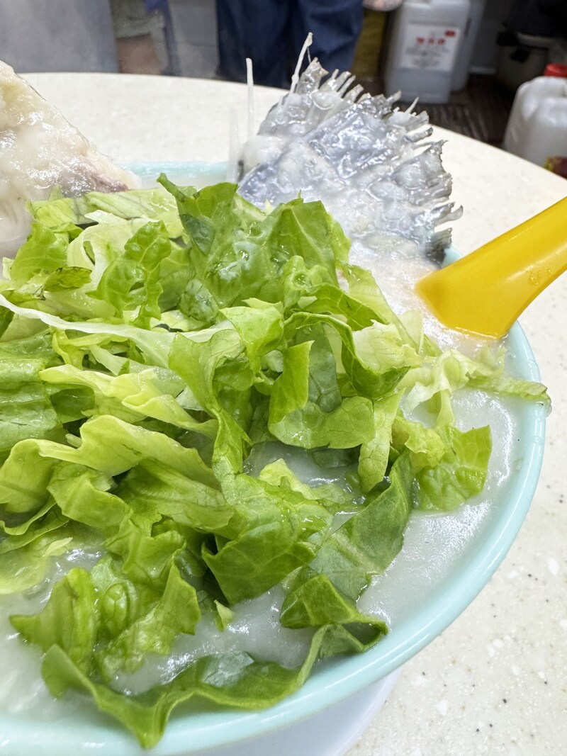 魚のシッポが大量に入ったお粥があります。だいたい3~4尾くらいのシッポが入ってて、そこにレタスをのせて仕上げてあります。大きな丼には大量にシッポとお粥が入っていることから、なかなか冷めません。ずっと熱いです。