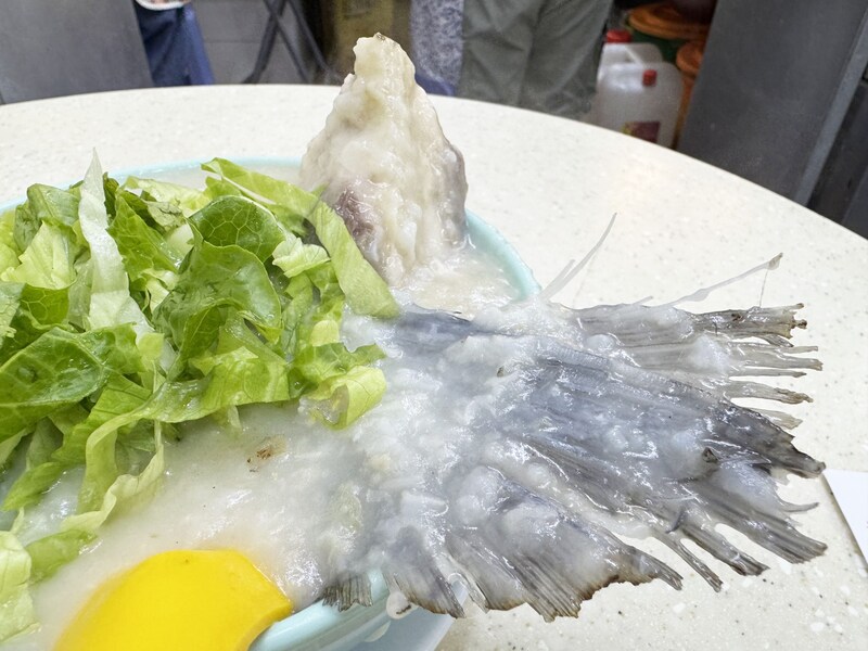 テーブルに出された状態では、目視で確認しにくいのですが、大量の魚のシッポがお粥の海に沈んでいます。