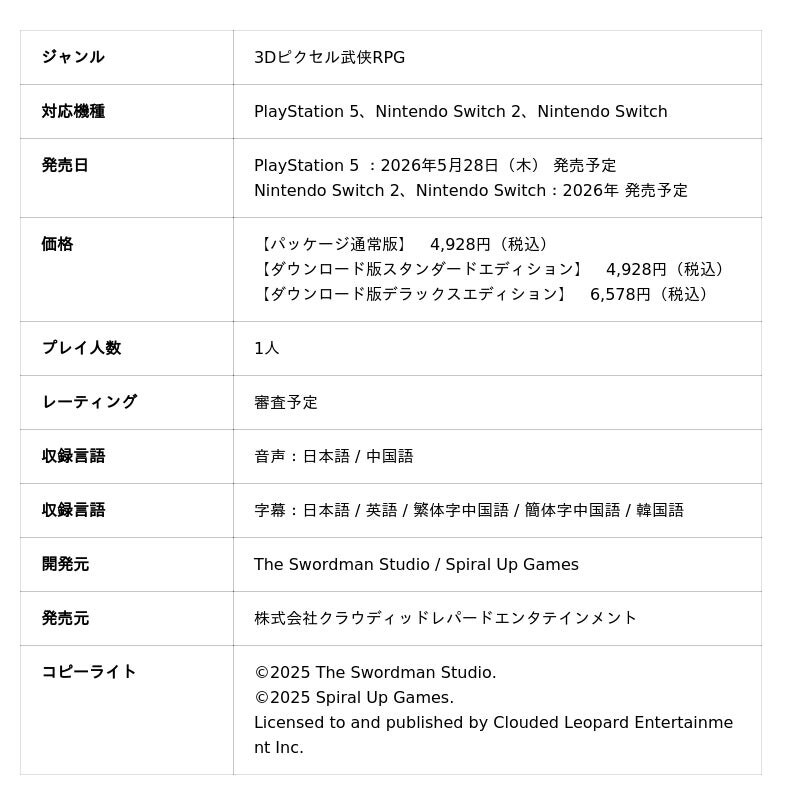 また、ゲーム本編と「デジタルサウンドトラック」や「アクセサリーセット」などがセットになったダウンロード版『Wandering Sword デラックスエディション』も同時に発売します。なお、PlayStation(TM)Storeでは、本日2025年11月12日(水)より、各ダウンロード版のプレオーダーを開始しました。