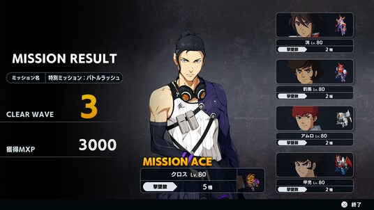 バトルラッシュに出現する敵の一団をWAVEと呼び、自軍フェイズ中に倒し切ればWAVEクリアです。一定のWAVEをクリアすると初回のみ特別報酬として、強力な強化パーツやCREDITが入手できます。また、このミッションは何度も繰り返し遊べ、クリアしたWAVEに応じて大量のMXPの獲得が出来ます。