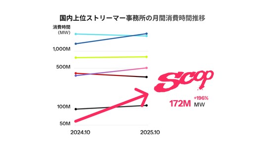 SCOP利用企業では、出稿後の指名検索数が3.6倍に増加したという結果や、国内ストリーマー事務所としてみると可処分時間消費ランキング6位にランクインするなど、急成長中のサービスです(※1)。