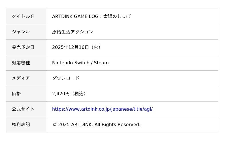 株式会社アートディンクは、Nintendo Switch(TM)、Steam(R)にて「ARTDINK GAME LOG:太陽のしっぽ」を2025年12月16日(火)に発売することを発表いたしました。