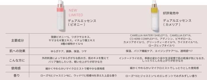 「デュアルエッセンス(ピオニー)」は、美容液層80%×美容オイル層20%の二層式処方。発酵ピオニー*1をはじめ、ツボクサエキスやヤマヨモギ葉エキスなど植物由来成分をたっぷり配合しています。