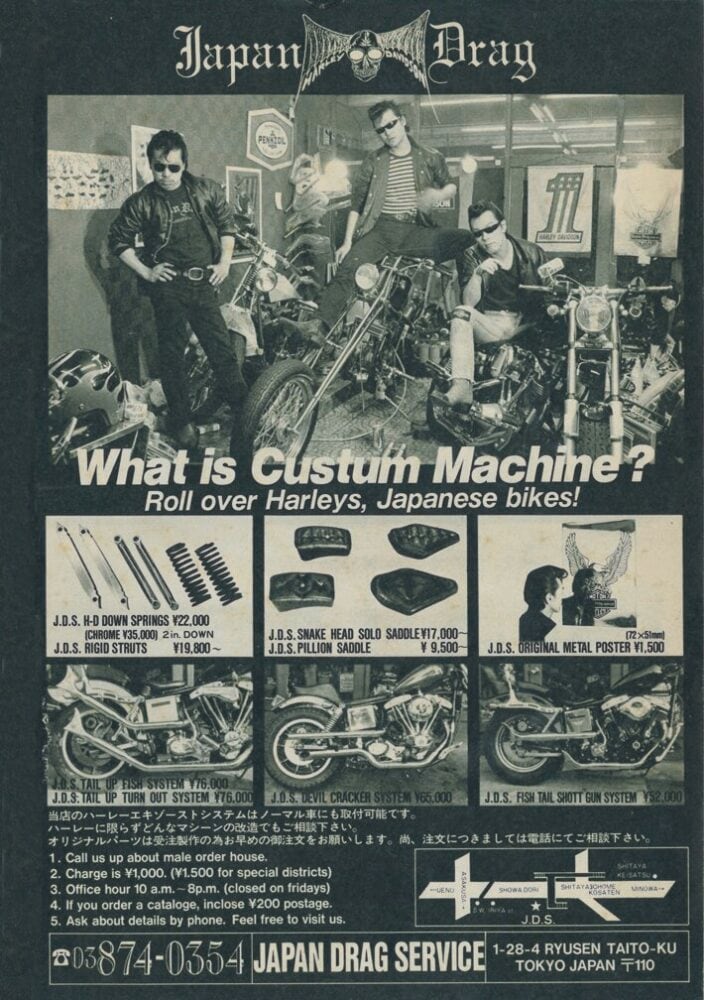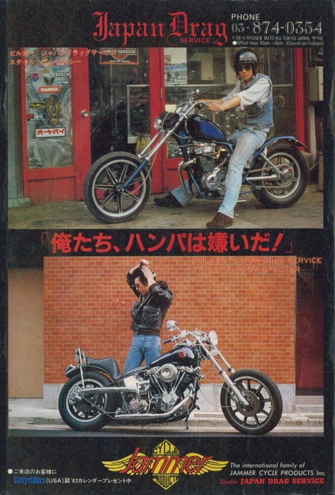 1973年に東京、原宿で結成され、75年にバンドとしてデビューすることとなったバイクチーム、「COOLS」の佐藤秀光氏も当時の若者たちに憧れと共にハーレーを広めた人物。81年に創業された「ジャパンドラッグ・サービス」の広告を見ても、影響力の強さがうかがえるだろう。その佐藤秀光氏は闘病生活の末、2025年3月に残念ながら逝去。享年73歳。