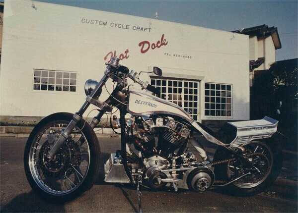 1984年に創業した「ホットドック」は同年の東京モーターサイクルショーにアルミ叩き出しボディのターボ付きショベル・カスタムでデビュー。当時の会場で大いに注目を集めたという。のちに多くのH-Dファンを魅了するロー&ロングのドラッグスタイル、この一台が、まさにその原点か。