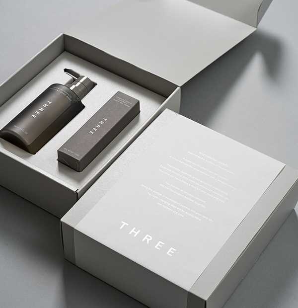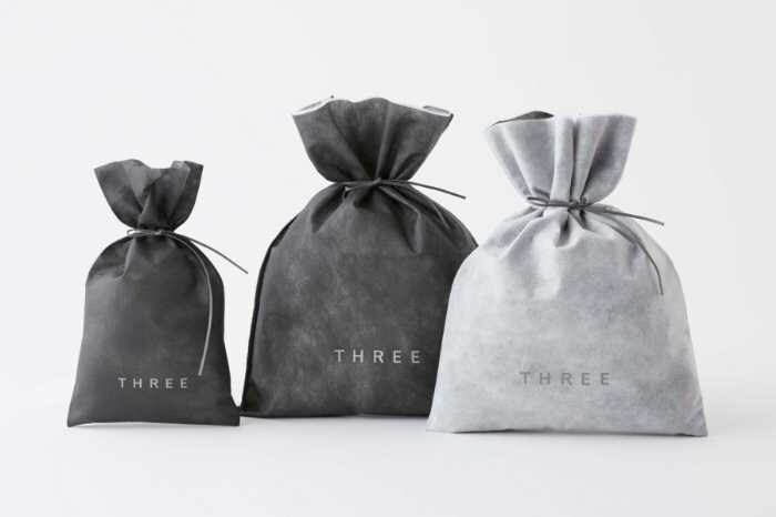 THREEのギフトラッピングは、シンプルで洗練されたデザインが魅力。古紙を40%以上使用したリサイクルペーパーで、上品な温もりとサステナブルな心遣いを感じられます。