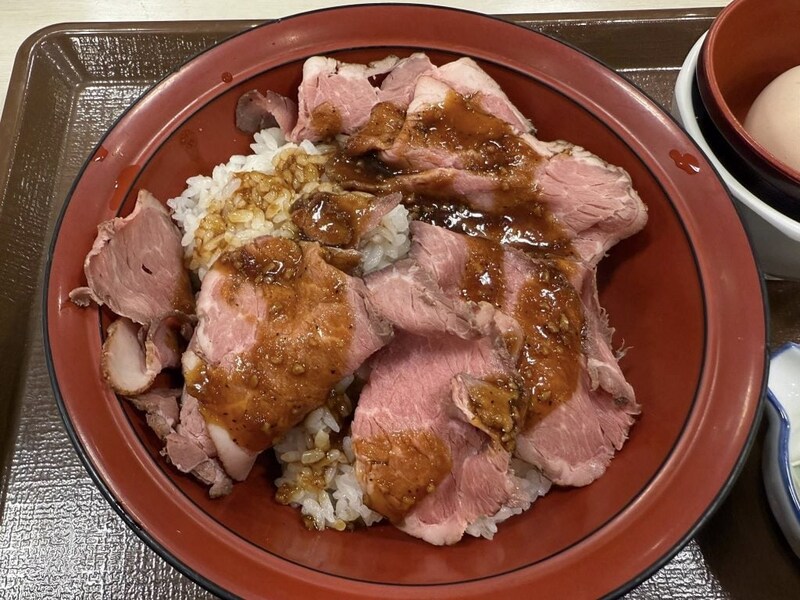 ローストビーフは薄切り、特製の醤油ダレがかかっている。