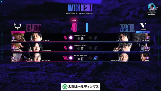 先鋒の「ときど選手」、中堅の「LeShar選手」の連続ストレート勝利で20-0となった「REJECT」。