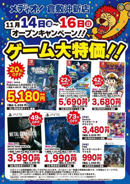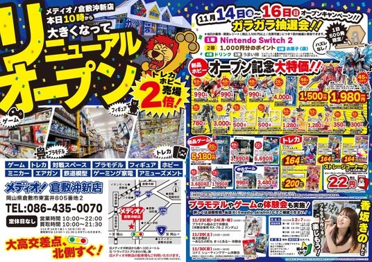 この度オープンする「メディオ!倉敷沖新店」は、既存の「メディオ!沖新店」に対しホビーの売場は3倍、トレーディングカードの売場は2倍に拡張。更にゲーム機、ゲームソフト、ゲーミング家電も新規で取り扱い、リニューアルオープンする店舗です。