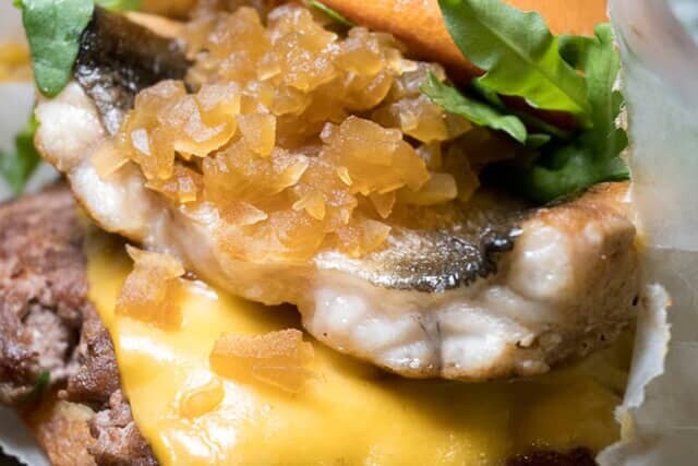 鰻は和食のイメージが強いですが、実は世界中で食べられている食材です。海外では馴染みのある “鰻と肉の組み合わせ” をハンバーガーでトライ。鰻は寝かせて旨味を引き出し、鉄板でジュっと焼き仕上げて、土佐醤油をつけて香ばしく仕上げます。トッピングは下からバンズ、アンガスビーフ100%のパティ、チェダーチーズ、鰻、奈良漬け、セルバチコ、山椒ソースが重なります。