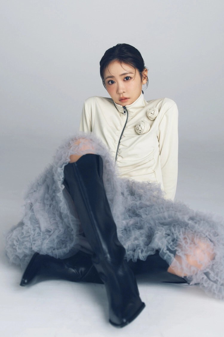 足元に男前なレザーを入れるなら、ふわっと広がるボリュームスカートでほどよい塩梅の甘辛MIXに。ハンサムムードを崩さないトップスはバラモチーフでさりげない甘さを。