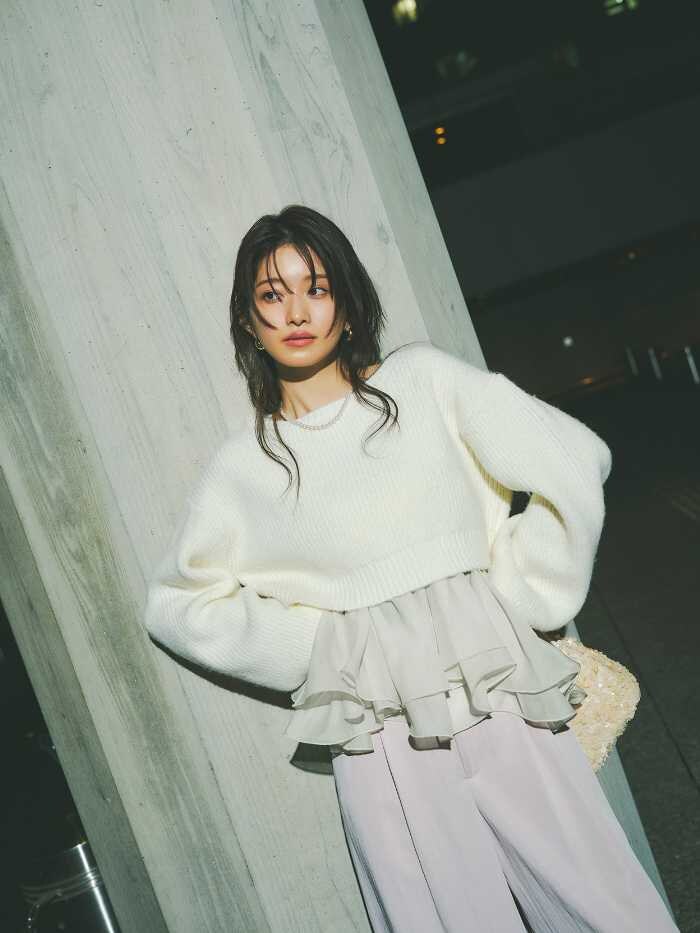 ONもOFFも楽しめる「KNIT×CAMISOLE SET」(¥14,300)や、動くたびにフリルが揺れる「KNIT×ONE-PIECE SET」(¥19,800)は、着るだけで心が弾む特別な一枚。