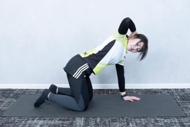 続けて反対側も同様に行います。なお、期待する効果をきちんと得るためには「骨盤を曲げないこと」がポイント。骨盤が曲がってしまうと体が傾き、十分に胸椎を伸ばすことができません。ぜひ習慣化して痩せ体質化をめざしていきましょうね。<ストレッチ監修:本間(トレーナー歴5年)>