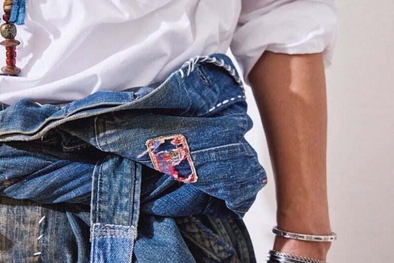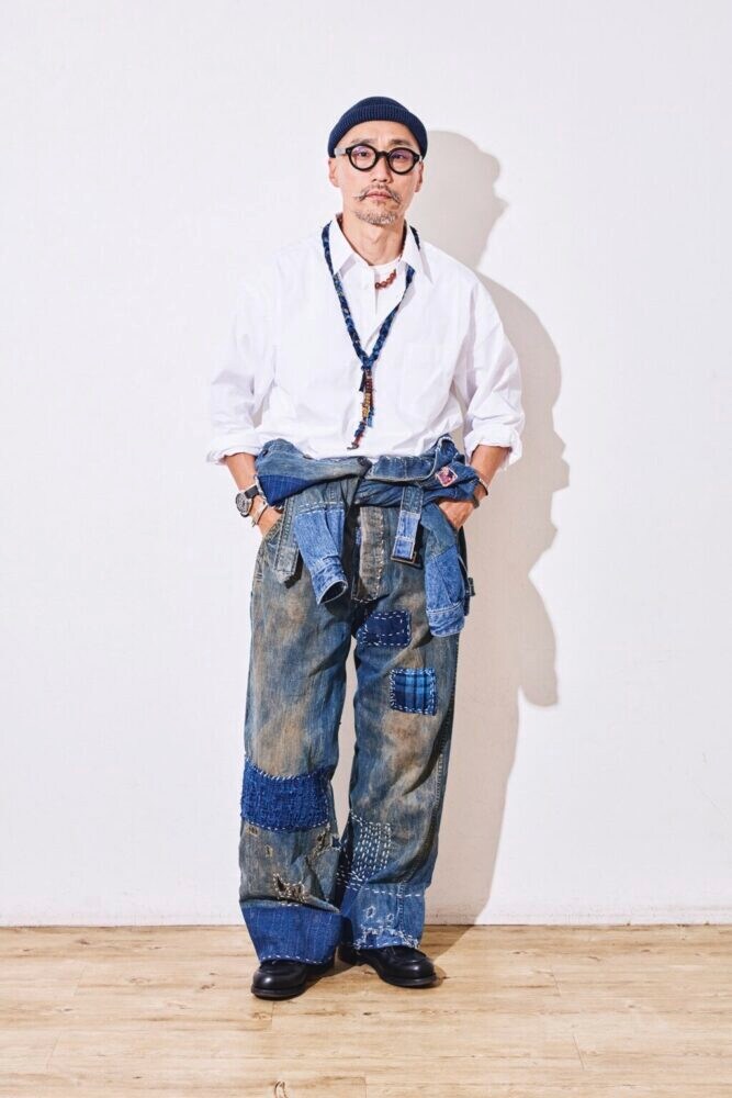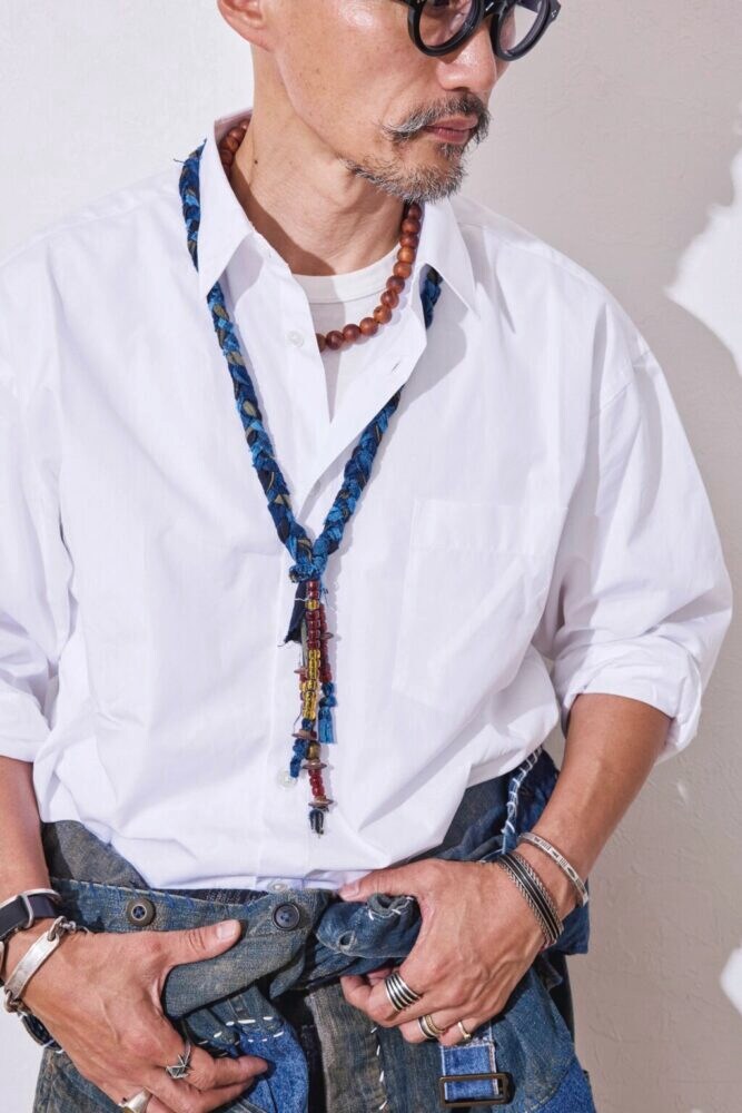 綺麗なシャツには、これでもかというボロアイテムを合わせたいと語るL.L.Woodさん。「着用するアイテムの中でのメリハリこそが、スタイリングの秘訣です」。シャツ2万900円/ワイパー(ワイパーTEL092-791-5252)、その他私物