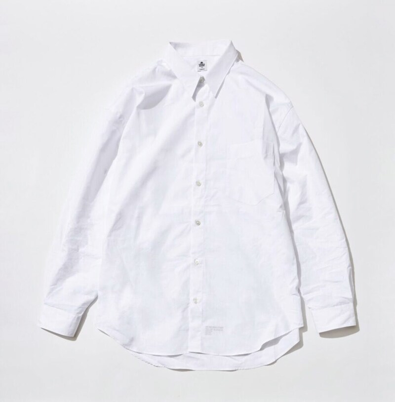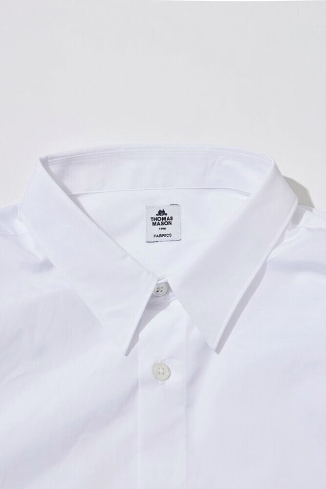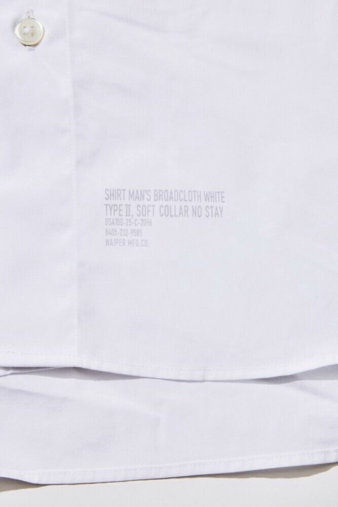 1970年代のアメリカ軍オフィサーシャツをベースに、素材と縫製に徹底的にこだわった上質な一枚である。英国の老舗「トーマス メイソン」の生地を採用、襟からは芯を抜き柔らかくコンパクトなレギュラーカラーに、樹脂製ボタンは高級感ある貝ボタンへとアップデート。裾へ施されたインストラクションスタンプは、タックアウト時のさりげないアクセントとなる。2万900円