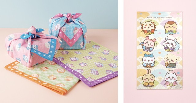 (左)「小風呂敷(全4種)」(各1,320円)、(右)「のれん」(3,850円)/和装に着替えたちいかわたちがあしらわれた、おめでたいデザインです。