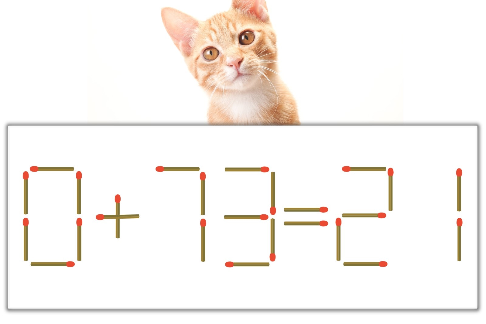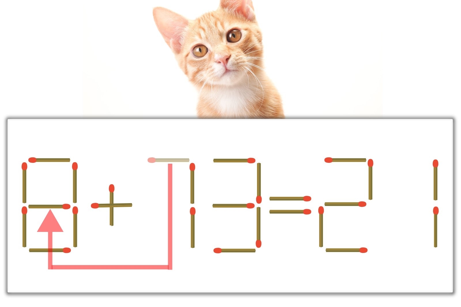 問題の「7」を別の数字に変化させると答えが出せそうです。7のマッチ棒を左に移動し、「0」を「8」に変化させると「8+13=21」が完成!