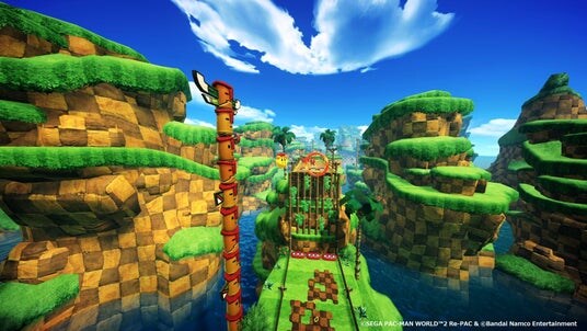 青い空に白い雲が浮かび、ヤシの木やトーテムポールが並ぶ南国風の風景。チェッカーパターンの地面や崖など、グリーンヒルの世界観をパックマンワールドに再構築。