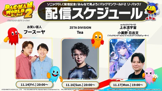 また、「ソニック・ザ・ヘッジホッグ コラボレーションコンテンツ」の配信を記念して、「ソニックDLC配信記念!みんなで見よう!パックマンワールド2 リ・パック!」と題して、様々な方に本作をプレイいただきましたので、以下より詳細をご確認ください。