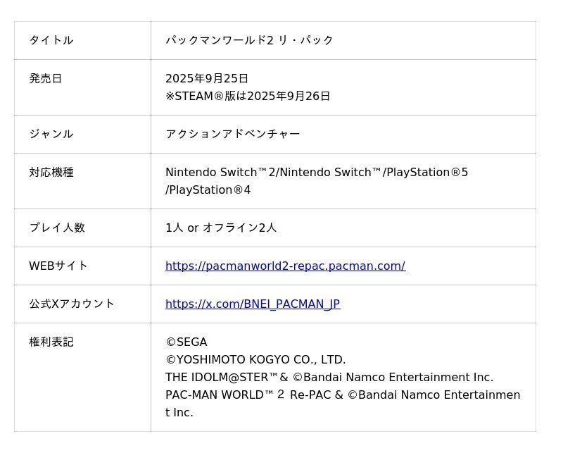 株式会社バンダイナムコエンターテインメントは、Nintendo Switch(TM)2/Nintendo Switch(TM)/PlayStation(R)5/PlayStation(R)4/Xbox Series X|S/Xbox One/STEAM(R)にて好評発売中の家庭用ゲーム『パックマンワールド2 リ・パック』 について、「ソニック・ザ・ヘッジホッグ コラボレーションコンテンツ」の配信を開始したことをお知らせいたします。