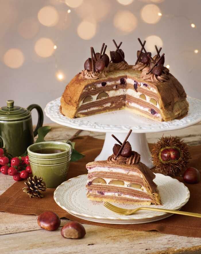 Afternoon Tea LOVE&TABLEから、クリスマスシーズン限定のミルクレープが登場♡11月13日(木)より順次発売される「ベリーとマスカルポーネのクリスマスミルクレープ」(2,013円・お茶付き)をはじめ、新作の「ラ・フランスと自家製キャラメルクリームのミルクレープ」(1,903円・お茶付き)や「マロンとチョコレートクリームのミルクレープ」(1,815円・お茶付き)で、華やかに。