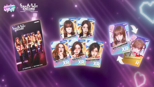 体験プレイイベントとして開催期間中、『Rhythm Hive』ブースに設置の試遊端末でLE SSERAFIMの1st Single 'SPAGHETTI'を体験プレイしていただいた方に、限定ノベルティ「特製フォトクーポンカード」を進呈します。ノベルティに記載のクーポンコードを『Rhythm Hive』で使用すると ゲーム内アイテム「HOT Albumテーマ Aグレードセット」を入手することができます。