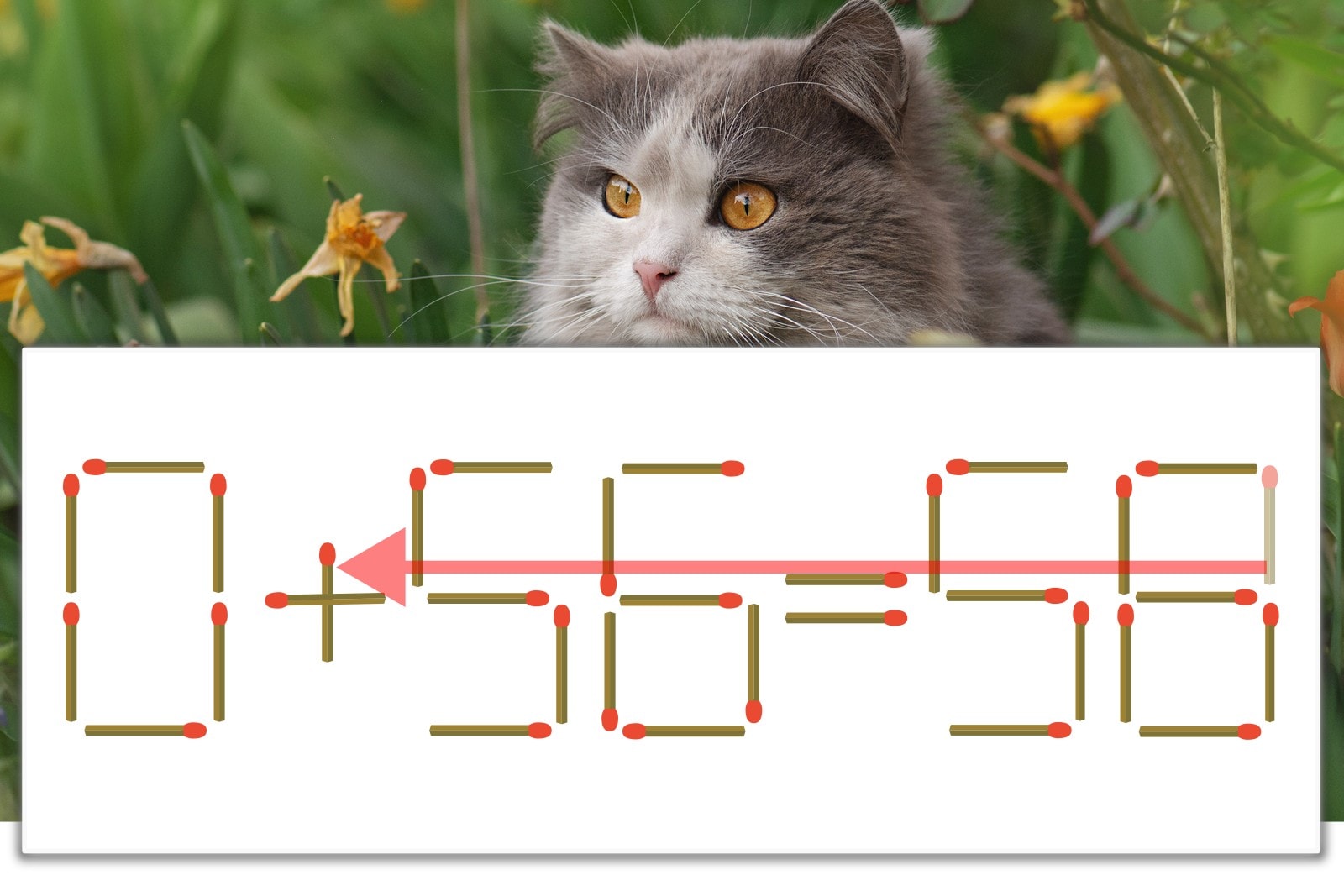 「8」を別の数字に変化させると答えが導き出せます。「8」のマッチ棒を1本移動して、「-」を「+」にしてみましょう。すると、「0+56=56」が成立します。