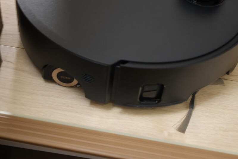 ボディ右前にある細い3本の回転式ブラシが、部屋のエッジ部分や、家具の足の下にあるホコリを掻き出して、それをメインのローラーと吸入口が吸い取ってくれる。これは、手で掃除機を使ってる時にカバーできていない部分のホコリも吸い取れていると思う。そして、そういうところにこそホコリが積もるのだ。この回転ブラシ、根元がアームになっていて少し伸びる。コーナー部分などはそうやって掃除しているようだ。