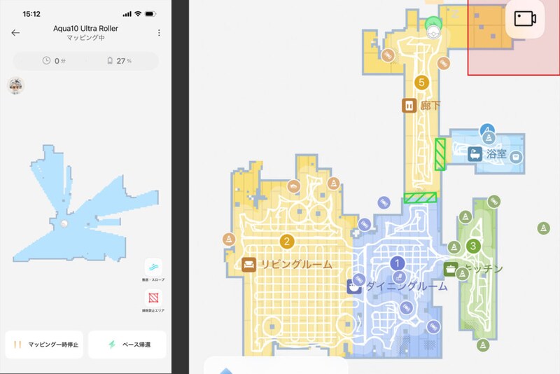 最初は1階でマッピングを実行。Dreame Aqua 10 Ultra Rollerは、LiDAR SLAM(ライダーによる同時定位と地図作成)で非常に精度の高いマッピングを行い、環境を把握する。操作は専用アプリから簡単にでき、さまざまな設定もこのアプリから行う。