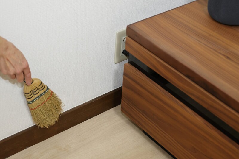 それから、家具の上や、壁の下部の巾木(はばき)の部分に溜まってるホコリを掃き下ろしておくと、それもロボット掃除機が吸い取ってくれて便利。こうしたちょっとした下ごしらえで、さらに部屋がきれいになる。