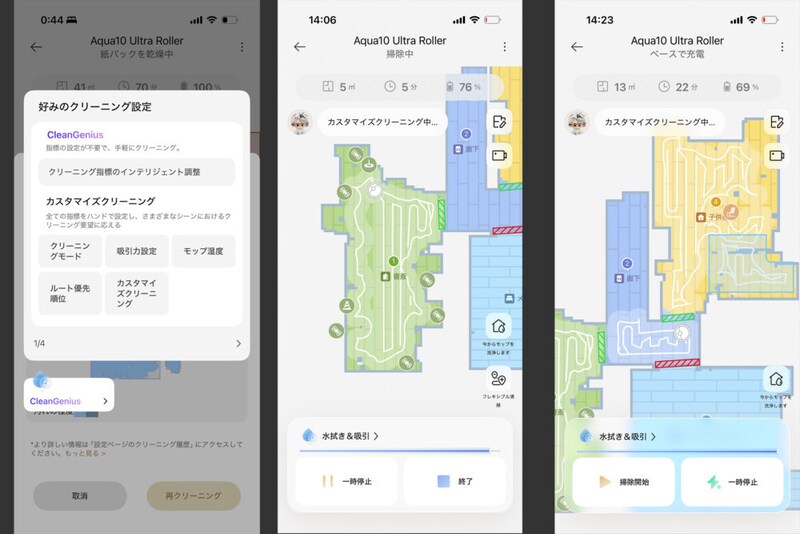 このアプリが実に良くできていて、モップやブラシをコーナーなどで突出するかどうか、カーペットがあった時にどうするか、家具など障害物に対してどのぐらい攻めるか(当たっていいのか、間を開けて回避するのか……などの細かい設定が可能。さらに、掃除の予約もできるし、掃除の履歴もずらりと残る。