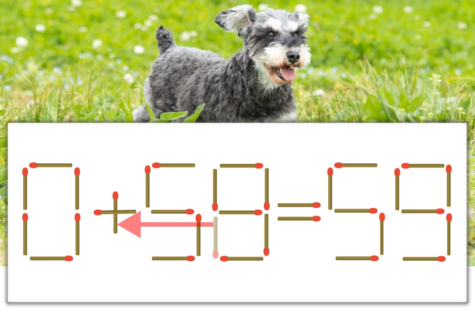 「8」を別の数字に変化させると答えが導き出せます。「8」のマッチ棒を1本移動して、「-」を「+」にしてみましょう。すると、「0+59=59」が成立します。
