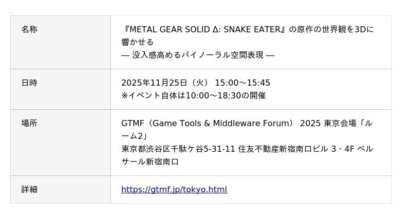 「METAL GEAR SOLID Δ: SNAKE EATER」における『Sound xR Core』を使ったサウンドデザインに関して、株式会社コナミデジタルエンタテインメントとヤマハ株式会社の開発メンバーによるセッションを、ゲーム開発者向けソリューションの総合イベント「GTMF(Game Tools & Middleware Forum)2025」東京会場で開催します。