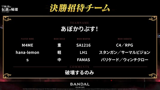 チーム「あぽかりぷす!」に対して行われた試合後のインタビューでは、チームメンバー(M4ME選手、hana-lemon選手、s選手)が声を出し合うコールが勝利の決め手になったと語りました。