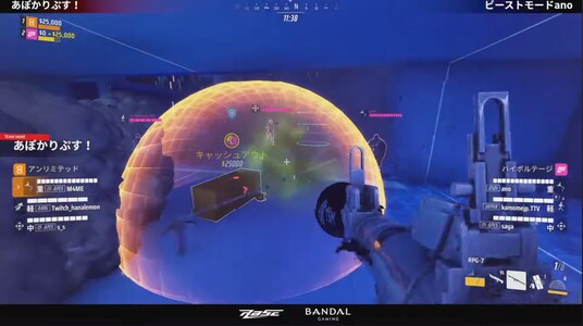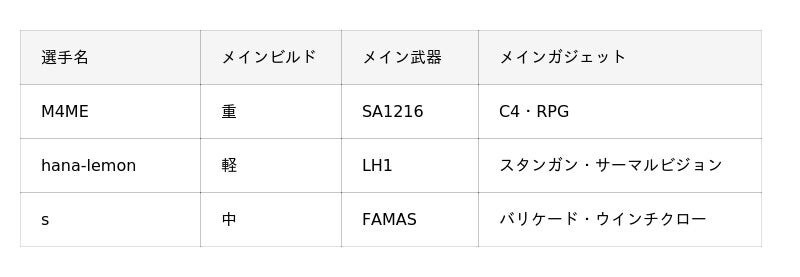 hana-lemon選手がスタンで敵チームのリソースを削り、s選手がバリケードで時間を稼ぎ、M4ME選手が最前線で押し切る。まさに“王者の形”が炸裂。