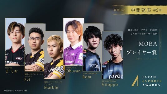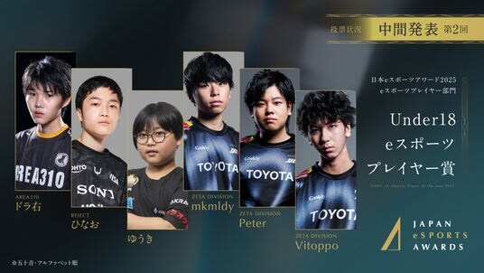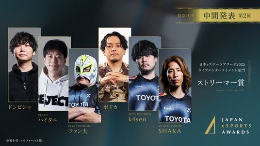 一般社団法人日本eスポーツ協会(会長:早川英樹 以下、JESU)は、2026年1月12日(月・祝)に横浜市にて開催される「日本eスポーツアワード2025」のファン投票について、中間発表をお知らせします。ファン投票は9月1日(月)より受付を開始しており、約2か月間の集計結果となります。