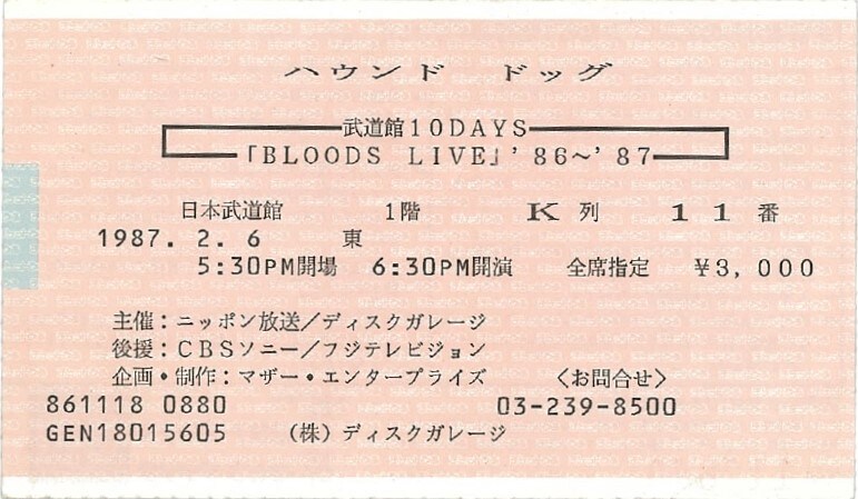 デビュー間もない頃の大友康平がパーソナリティを務めていたラジオ番組『明治製菓提供ザ・ビートルズ』を愛聴していた者としては、ハウンドドッグのブレイクはこの上なくうれしく、ひとりほくそえんでいたのだが、武道館公演が近づくといてもたってもいられなくなり、チケット入手に奔走した。たしか購入経由はチケットは雑誌『ぴあ』のはみだしぴあだったと思う。「チケット余ってます」という一文に反応し、公演日直前にやりとりしたにもかかわらず、座席は1階後方、バンドもよく見え、客の盛り上がりダイレクトに感じられるものであった。最新作『LOVE』を中心にしたライブは思いのほか素晴らしく、全力で熱唱する大友康平に胸を打たれた。しばらく興奮が冷めず、ハウンドドッグを追いかけるようになり、その後の西武球場や東京ドーム公演にも足を運ぶほどの熱の入れようであった。