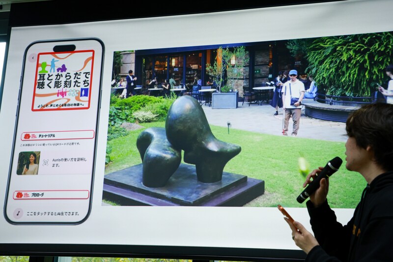 今回の報告会では、三菱地所との連携事業として丸の内仲通り(丸の内ストリートギャラリー)で開催されている「耳とからだで聴く彫刻たち 『Auris』で拡がるあたらしいアート体験」の経過報告が行われた。本イベントでは、エリア内にある彫刻作品を視覚障がい者を含む誰もが楽しめるようなガイド体験を提供している。