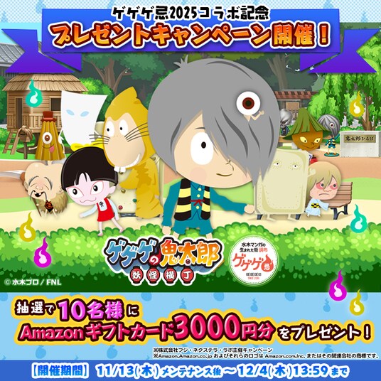 『ゲゲゲの鬼太郎妖怪横丁』の公式Xでは『ゲゲゲ忌2025』とのコラボイベントを記念したプレゼントキャンペーンを開催します。ご応募いただいた方の中から抽選で10名様に3,000円分相当の「Amazonギフトカード」をプレゼントします。