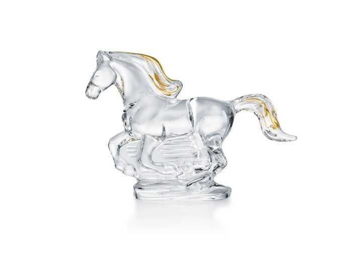 クリア71,500円/ゴールド96,800円(高さ12.5cm・幅17.9cm)のラインアップで、ゴールドのたてがみと尾には20カラットの金彩が施され、光を受けるたびにまばゆく煌めきます。